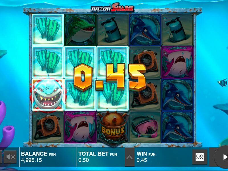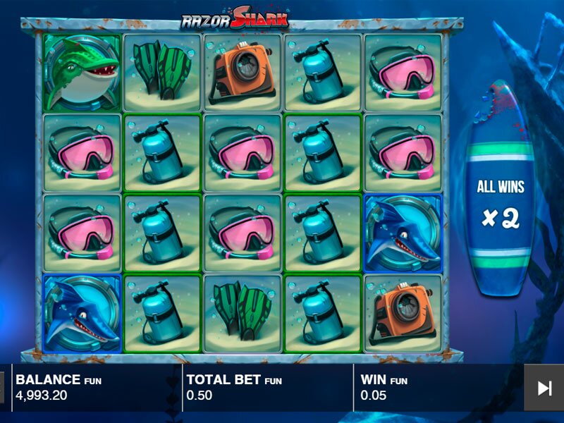 Alle Symbole im Razor Shark casino Spiel entsprechen dem Unterwasserthema. Neben den Algen und einer Unterwasserkamera gibt es Flossen, eine Maske und eine Sauerstoffflasche. Kann man davon ausgehen, dass sie alle demselben unglücklichen Taucher gehörten, der von hochwertigen Haisymbolen gefressen werden konnte? Aber das ist nur eine Vermutung.